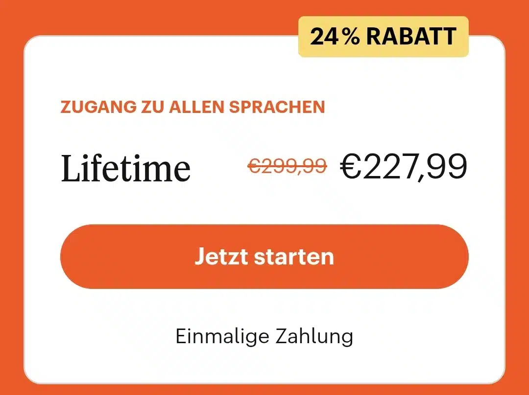 💡Lifetime-Angebot zum kleinen Preis!227,99 Euro für die lebenslange Lizenz sind dir zu teuer? Dann schaue dir den Lifetime-Deal des Wettbewerbers Mondly an. Für nur 122,48 Euro (Mondly Neujahrsangebot) erhältst du lebenslangen Zugriff auf 41 Sprachen. 👉 Alle Details zu Mondly findest du in meinem ausführlichen Testbericht. | zum Angebot* |