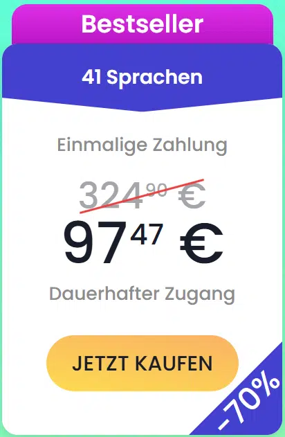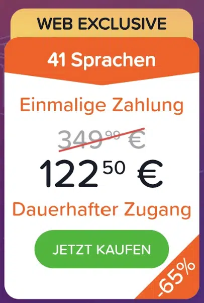 Das Lifetime-Angebot (einmal zahlen, lebenslang nutzen) ist kaum teurer als das 1-Jahres-Abo, daher dürfte dieses für die meisten Lernenden die attraktivere Wahl sein. Das Angebot mit Einmalzahlung und lebenslangem Zugriff enthält den Zugriff auf alle 41 Sprachen und ist zum Preis von nur 122,50 Euro erhältlich. Darin enthalten sind auch alle künftigen Upgrades und Erweiterungen des Lernprogramms. Wie ich finde ein preislich äußerst attraktives Angebot. (Hinweis: Das Lifetime-Angebot ist allerdings nicht immer erhältlich, sondern nur in gewissen Aktionszeiträumen. Klicke auf den folgenden Link um zu überprüfen, ob das Sonderangebot gerade erhältlich ist).