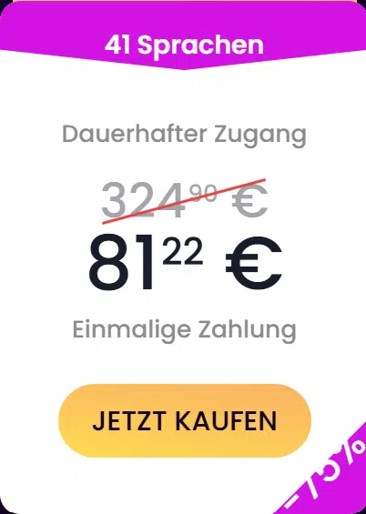 Das Lifetime-Angebot (einmal zahlen, lebenslang nutzen) ist kaum teurer als das 1-Jahres-Abo, daher dürfte dieses für die meisten Lernenden die attraktivere Wahl sein. Das Angebot mit Einmalzahlung und lebenslangem Zugriff enthält den Zugriff auf alle 41 Sprachen und ist zum Preis von nur 81,22 Euro erhältlich. Darin enthalten sind auch alle künftigen Upgrades und Erweiterungen des Lernprogramms. Wie ich finde ein preislich äußerst attraktives Angebot. (Hinweis: Das Lifetime-Angebot ist allerdings nicht immer erhältlich, sondern nur in gewissen Aktionszeiträumen. Klicke auf den folgenden Link um zu überprüfen, ob das Sonderangebot gerade erhältlich ist).