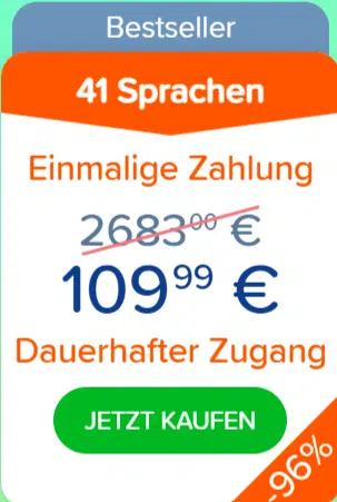 Das Lifetime-Angebot (einmal zahlen, lebenslang nutzen) ist kaum teurer als das 1-Jahres-Abo, daher dürfte dieses für die meisten Lernenden die attraktivere Wahl sein. Das Angebot mit Einmalzahlung und lebenslangem Zugriff enthält den Zugriff auf alle 41 Sprachen und ist zum Preis von nur 122,50 Euro erhältlich. Darin enthalten sind auch alle künftigen Upgrades und Erweiterungen des Lernprogramms. Wie ich finde ein preislich äußerst attraktives Angebot. (Hinweis: Das Lifetime-Angebot ist allerdings nicht immer erhältlich, sondern nur in gewissen Aktionszeiträumen. Klicke auf den folgenden Link um zu überprüfen, ob das Sonderangebot gerade erhältlich ist).